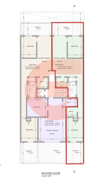 The property features an internal area of approximately 93.3 sqm and an external area of 28.1 sqm. Upon entering, one finds a bright open plan kitchen, dining and living area leading onto a front terrace of approximately 15.1 sqm, ideal for outdoor dining and relaxation. The layout includes 2 double bedroom, a main bathroom, and well-planned living spaces designed for comfort and practicality. At the rear, the property enjoys an additional private terrace measuring approximately 13 sqm, providing further outdoor living space.